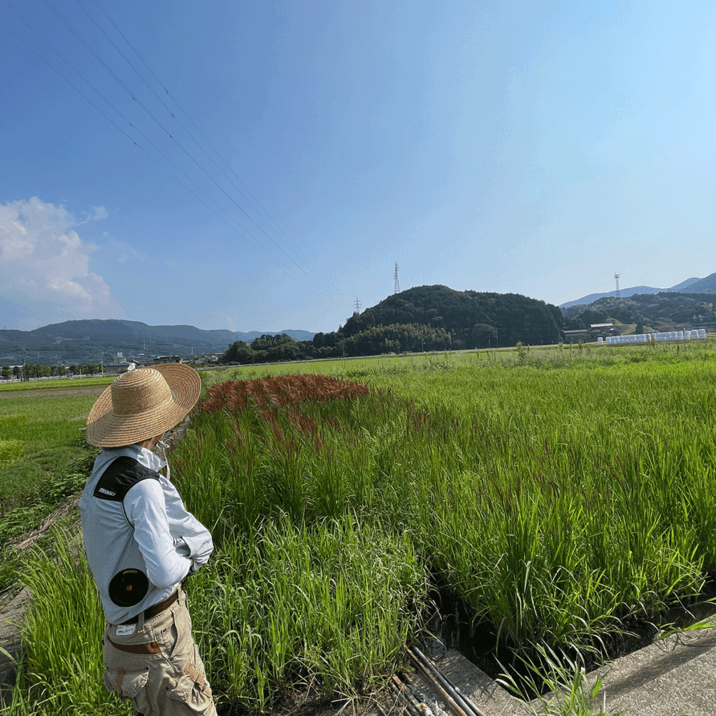 広い田んぼの中で、泥に足を取られながら雑草を抜く。
